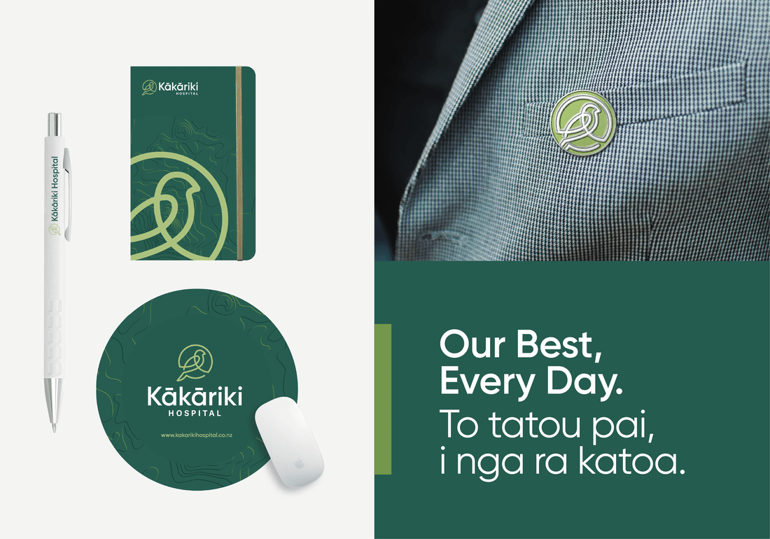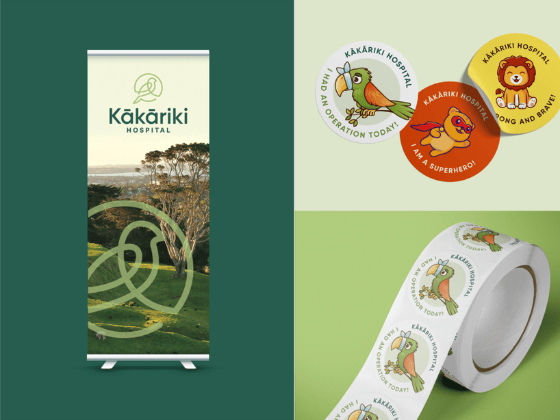 The Kākāriki Hospital brand draws inspiration from its namesake - the vibrant New Zealand parakeet, kākāriki, meaning ‘small green parrot’ in te reo Māori. The brandmark is a stylised interpretation of the bird, illustrated in a single continuous line to reflect the seamless, consistent care patients receive from start to finish. The brand’s green palette pays homage to the lush natural surroundings of the hospital, nearby is One Tree Hill and Cornwall Park, and right next door to the hospital stands a majestic pōhutukawa tree. Subtle topographic textures, inspired by the landscape around the hospital, add depth and a strong sense of place to printed and digital materials.