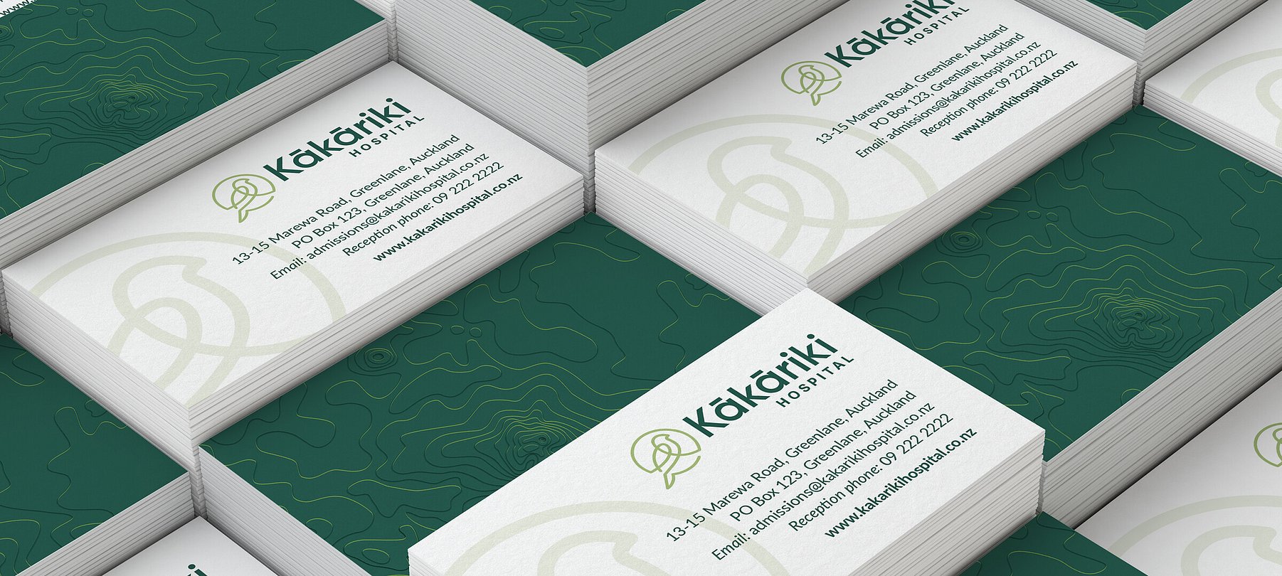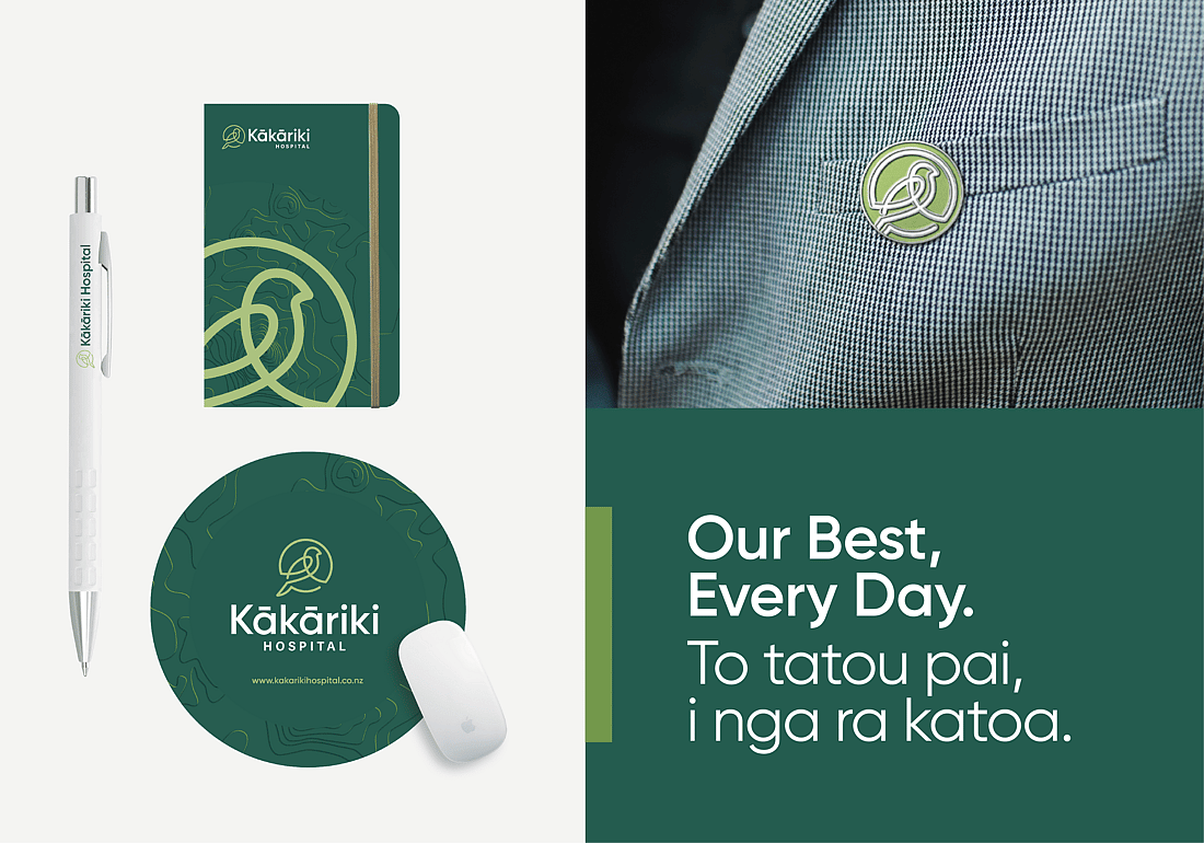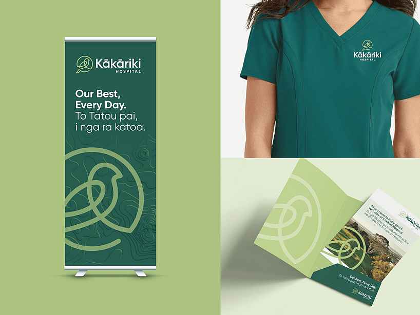 The Kākāriki Hospital brand draws inspiration from its namesake - the vibrant New Zealand parakeet, kākāriki, meaning ‘small green parrot’ in te reo Māori. The brandmark is a stylised interpretation of the bird, illustrated in a single continuous line to reflect the seamless, consistent care patients receive from start to finish. The brand’s green palette pays homage to the lush natural surroundings of the hospital, nearby is One Tree Hill and Cornwall Park, and right next door to the hospital stands a majestic pōhutukawa tree. Subtle topographic textures, inspired by the landscape around the hospital, add depth and a strong sense of place to printed and digital materials.
